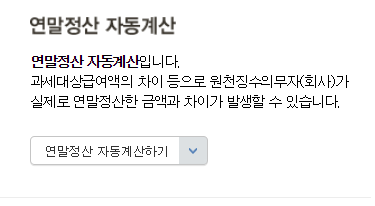 연말정산 자동계산이라는 메뉴를 클릭하신 후 자동계산을 할 수 있는데, 과세대상급여액의 차이가 있기 대문에 회사에서 실제로 연말정산한 금액과는 다소 차이가 있을수 있다고 하네요.