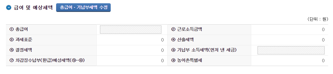 총급여액을 입력하고 세액감면 내역을 기입해주면 자동으로 연말정산 환급금에 대해서 조회를 해볼 수 있겠습니다.