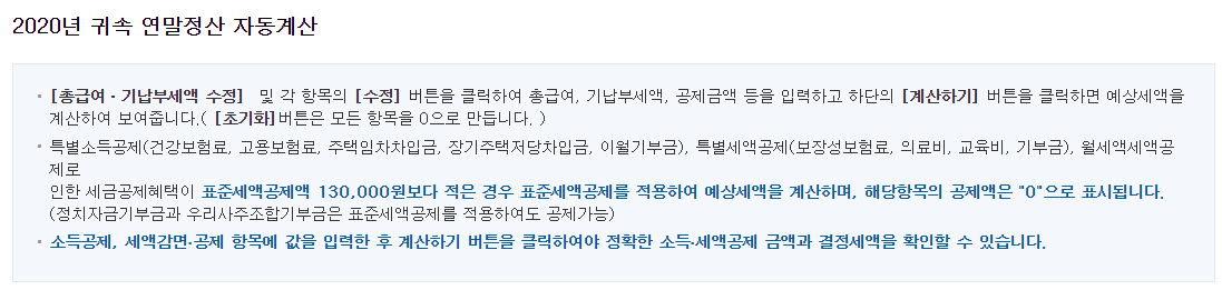 국세청 홈택스 2020 연말정산 자동계산기
